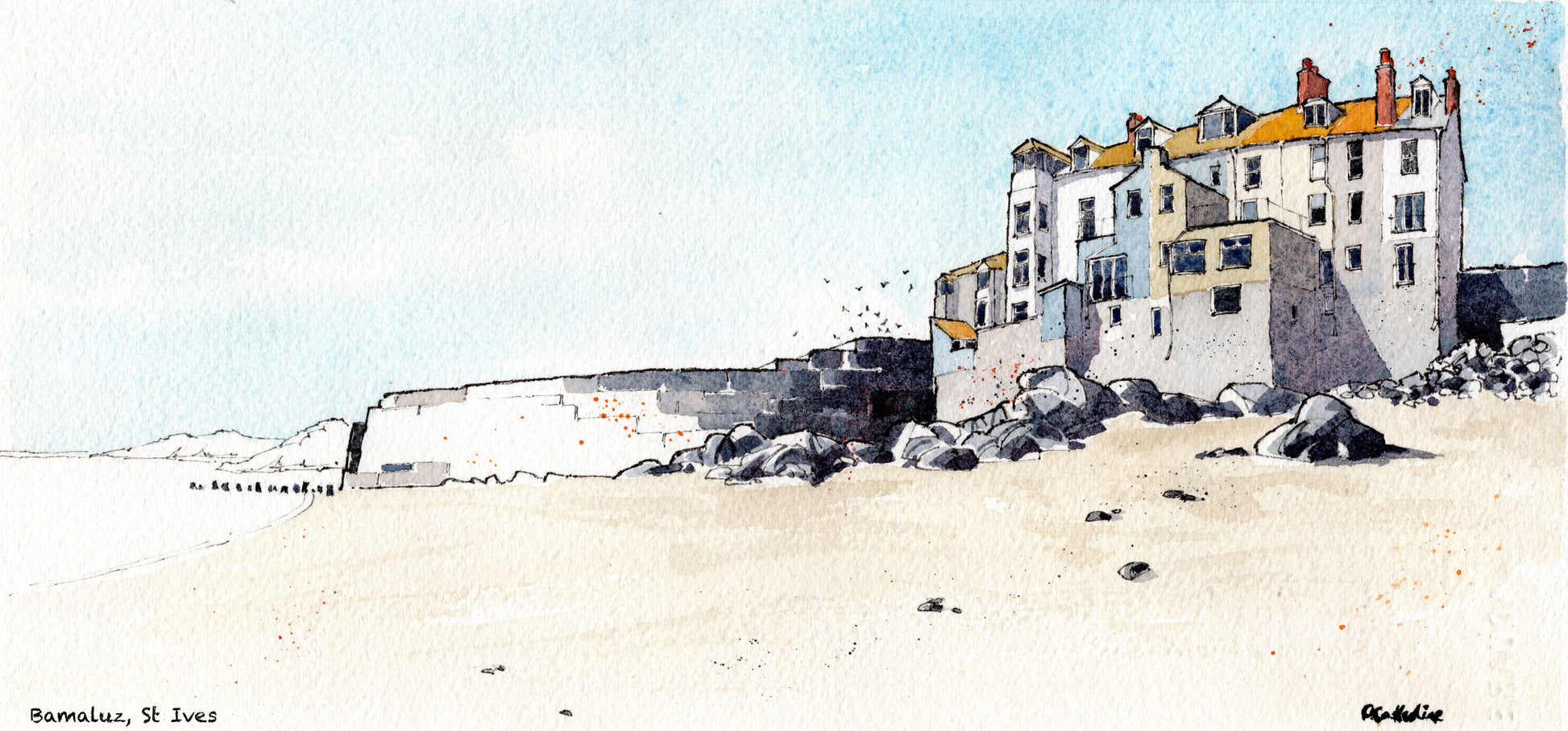 Based on an original ink and watercolour, painted in 2022. The outer dimensions measure 16 x 9 inches.
