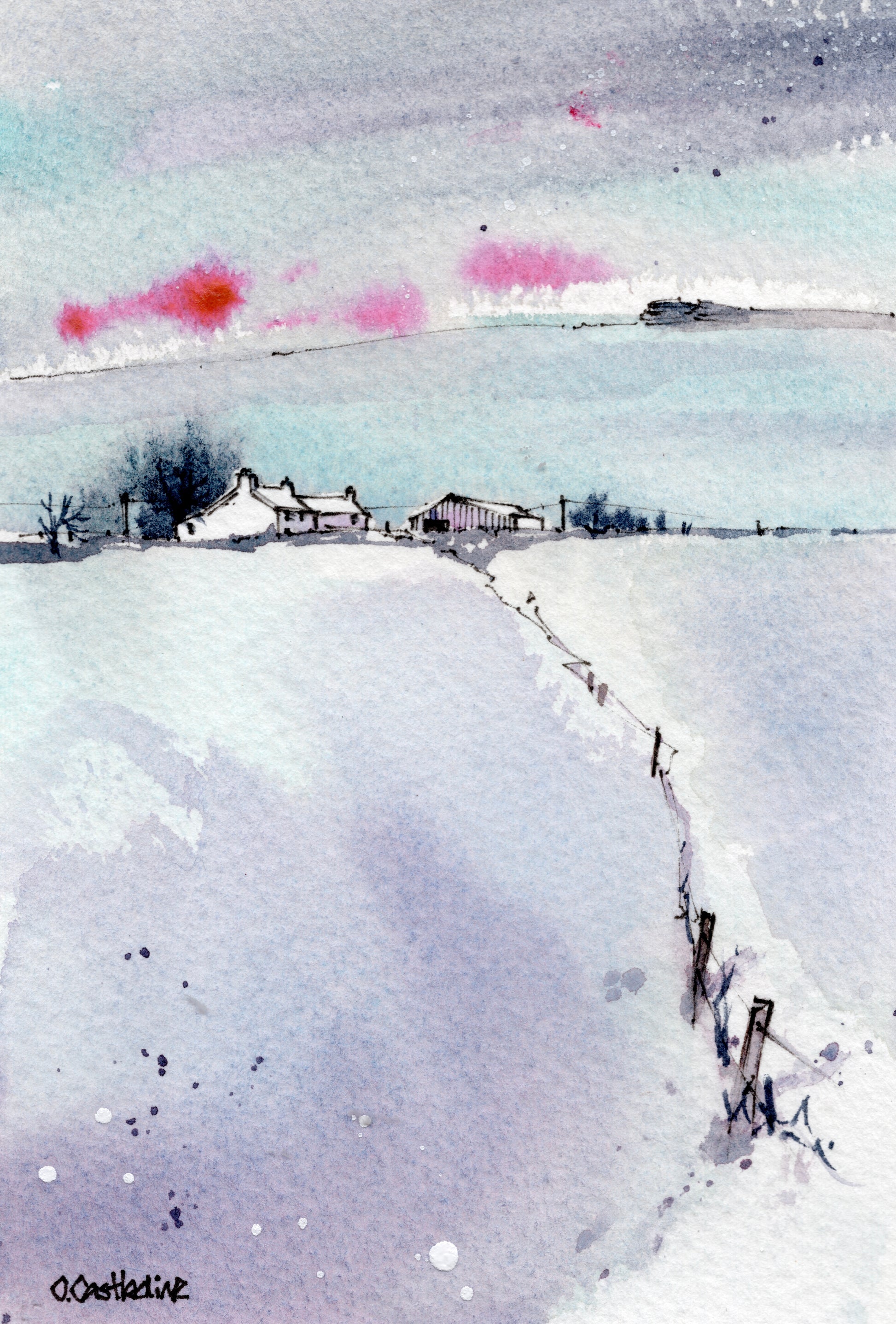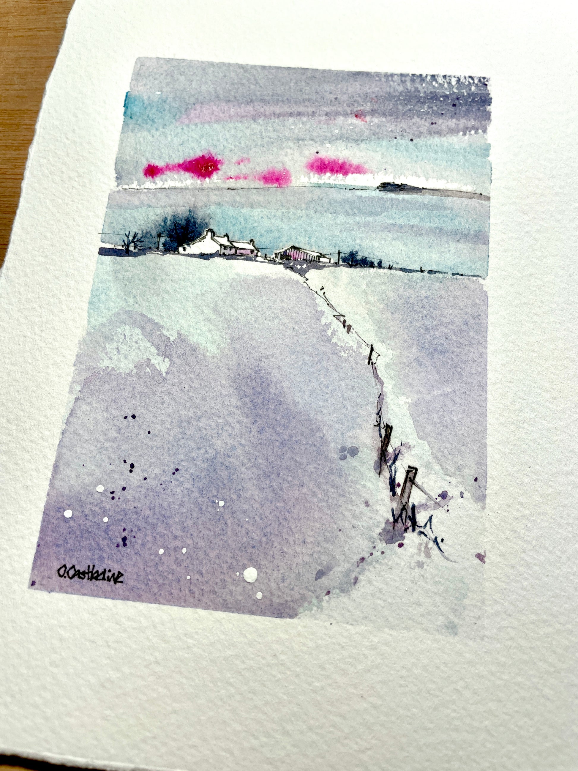 Moorland farm under a pop of pink sky. Watercolour with a little pen.