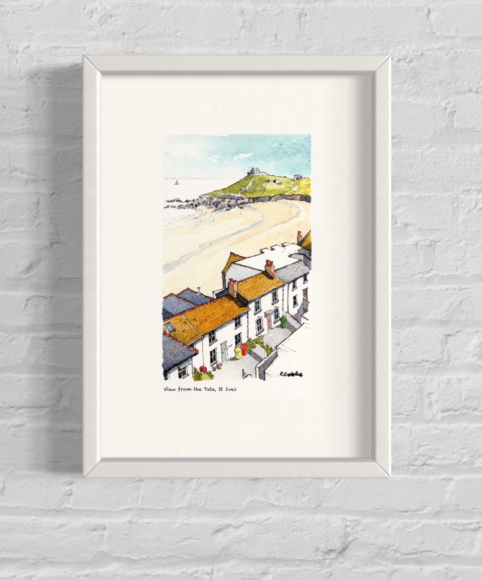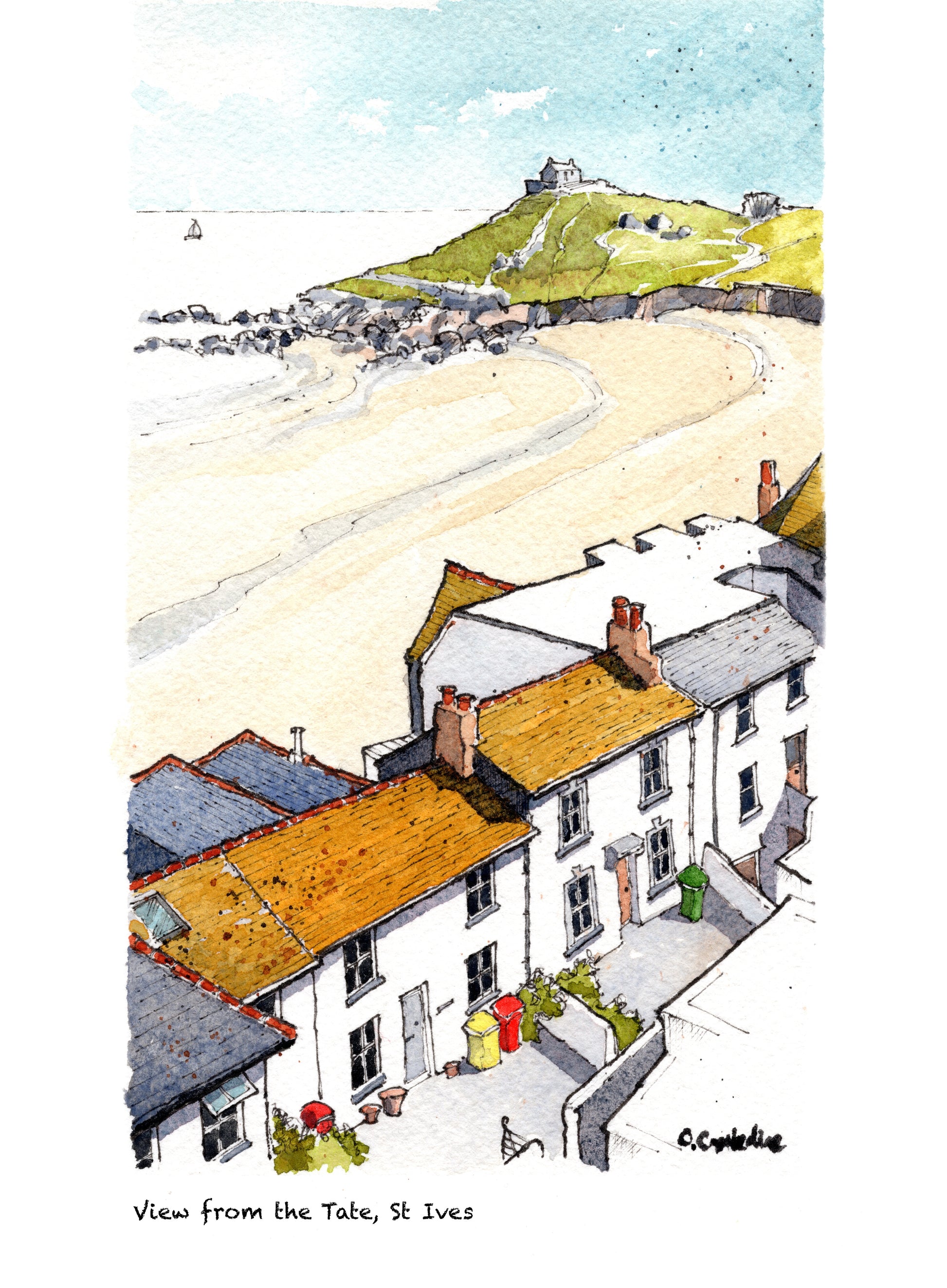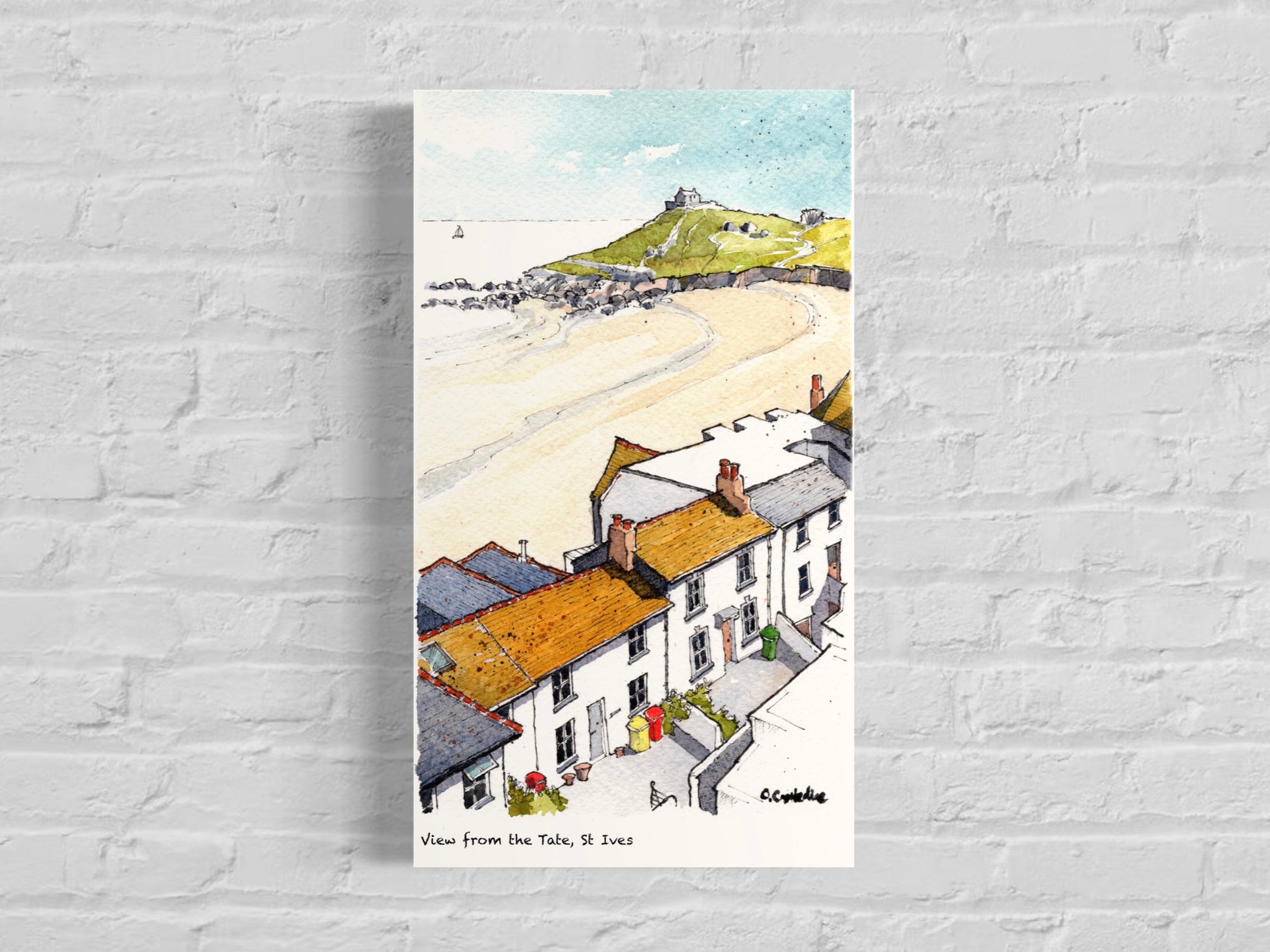 Porthmeor Beach viewed from Tate St Ives, based on an original watercolour painted in 2023.