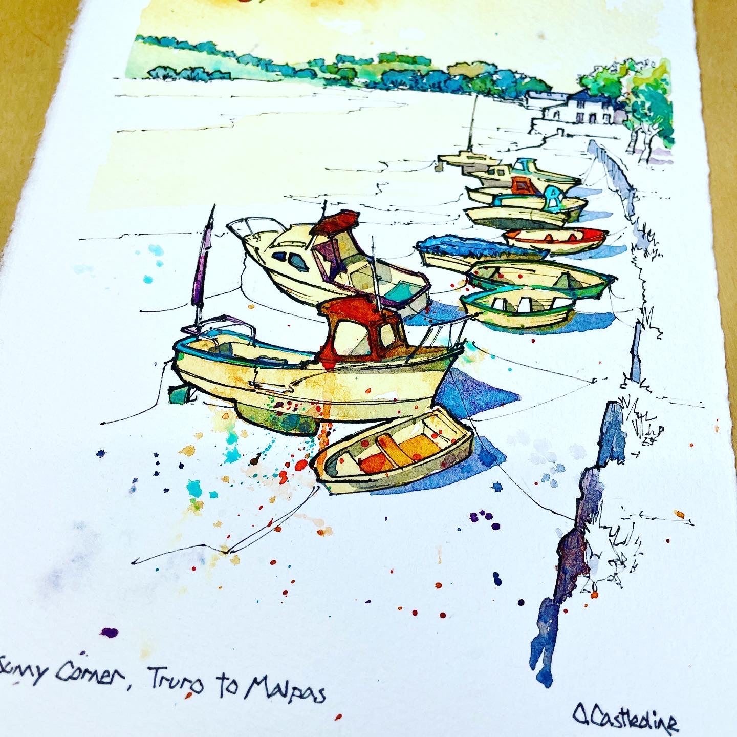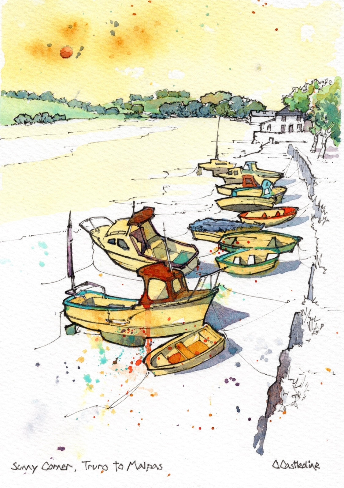 Ink and watercolour original painting of the boats at Sunny Corner between Truro and Malpas.